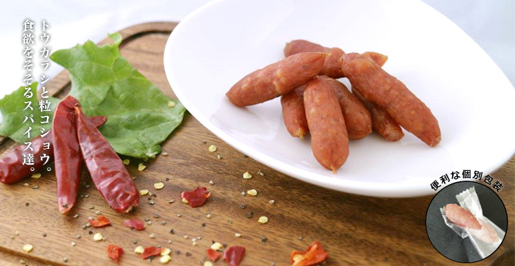 唐辛子や粒コショウの辛さと肉のおいしさが調和した一口サイズのサラミソーセージです。